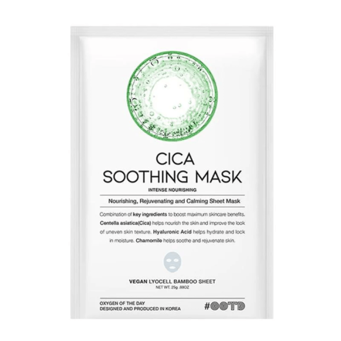 OOTD Cica Soothing Mask е успокояваща, подхранваща и подмладяваща маска за лице. Подходяща за всеки тип кожа. OOTD Лист маска с центела азиатиа помага за успокояване и подмладяване на кожата благодарениe на хиалуроновата киселина, центелата и лайката в състава си. Видимо стяга кожата, за да изглежда сияйна, подмладена и по-здрава.
