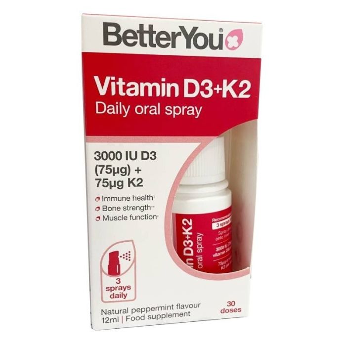 BetterYou Vitamin D3 + K2 Daily Oral Spray e създаден специално, за да ви снабди с висока доза от безценния за организма витамин D3 в комбинация с витамин К2, който съдейства за неговото ефективно усвояване. Редовната му употреба води до засилване на естествения имунитет, спомага за заздравяването на костите и ставите и по-доброто абсорбиране на калций и фосфор. Синергичният бленд от двата витамина предотвратява натрупването на калций в артериите и насочва минерала към костите, където той може да подобри здравината и плътността им. Бетър Ю Витамин D3 + K2 Орален спрей е хранителна добавка, разработена по съвременна формула, така че да се усвои бързо и ефективно от организма. Приемът на витамина чрез впръскване съдейства за постигане на по-качествено усвояване в кръвообращението.