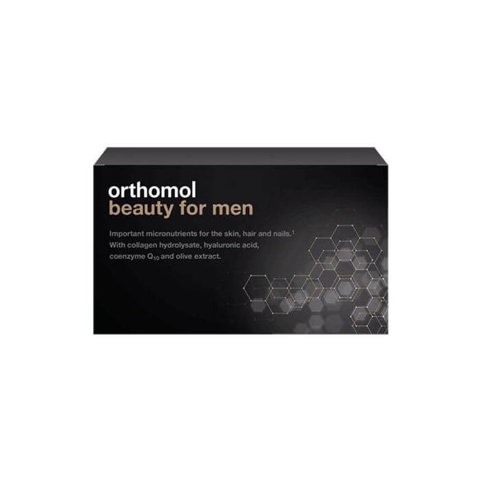 Orthomol Beauty Men е хранителна добавка, която съдържа важни микронутриенти за кожата, косата и ноктите. Ортомол Бюти за мъже съдържа колаген хидролизат, хиалуронова киселина, Коензим Q10, екстракт от маслини, Витамин С, Витамин Е, Биотин, Селен и Цинк. Витамин С допринася за нормалното формиране на колаген за нормално функциониране на кожата. Витамин С, витамин Е, цинк и селен допринасят за защита на клетките от оксидативен стрес. Биотин и цинк допринасят за поддържането на нормална кожа. Селен, биотин и цинк допринасят за поддържането на нормална коса. Селен и цинк допринасят за поддържането на нормални нокти. Без глутен и лактоза.