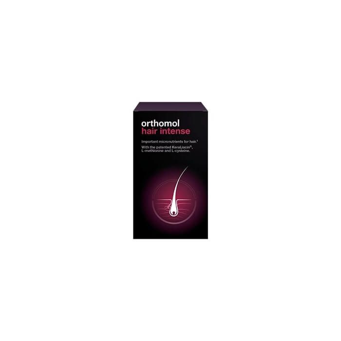 Orthomol Hair Intense е хранителна добавка, която съдържа важни витамини и микронутриенти за блестяща и силна коса, пълна с обем. Ортомол Хеър Интенз допълва хранителния прием с витамини и минерали. Съдържа L-метионин и L-цистеин, като подкрепа за поддържането на нормална коса. Биотин, селен и цинк допринасят за поддържането на нормална коса. Медът допринася за нормалната пигментация на косата. Цинк, мед и селен допринасят за защита на клетките от оксидативен стрес. Тиамин (Витамин В1), Витамин В6, Витамин В12, Биотин, Пантотенова киселина и Мед допринасят за поддържането на нормален енергиен метаболизъм. Витамин В6 допринася за нормалния синтез на цистеин. Пантотеновата киселина допринася за нормалния синтез и метаболизъм на стероидните хормони , Витамин Д и някои невротрансмитери.