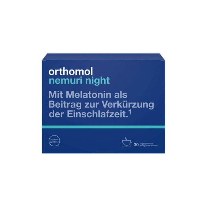 Orthomol Nemuri Night е хранителна добавка, която помага за съкращаването на времето за заспиване и подпомага спокойния сън. Ортомол Немури Найт е релаксираща топла напитка, комбинирана с прецизно балансирани микроелементи за нервната система, растителни екстракти за релаксация и аминокиселини. Мелатонинът допринася за съкращаване на времето за заспиване. Положителният ефект се забелязва, когато 1 mg Мелатонин се приеме малко преди лягане. Мелатонинът подпомага за облекчаване на субективните усещания при голяма часова разлика. Позитивният ефект се забелязва при прием на 0,5 мг мелатонин малко преди лягане на първия ден от пътуването и също така първите дни след пристигане. Витамин В6, ниацин и магнезий допринасят за нормалното психологическо функциониране и нормалните функции на нервната система.
