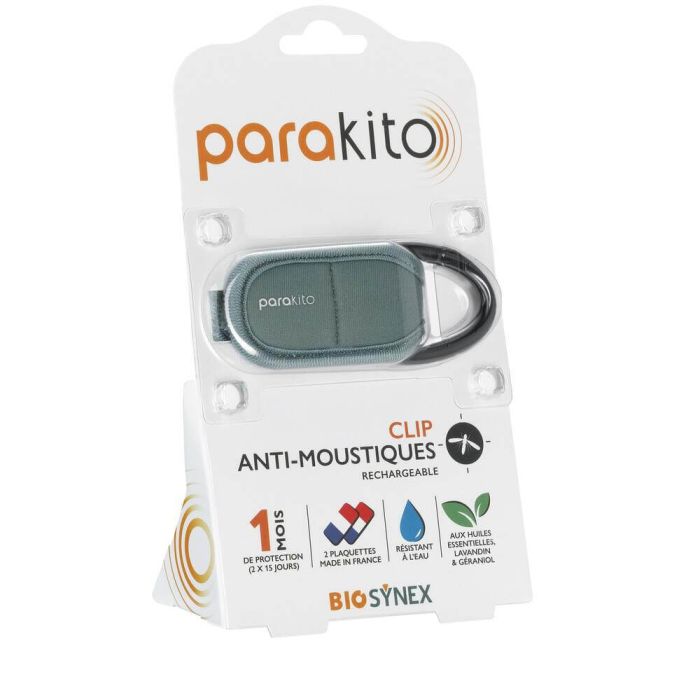 Parakito Клипс против комари Черен е отлично средство за защита от комари през лятото. Паракито Клипс против комари Черен е предназначен се отличава със стилен дизайн в черно. Осигурява дълготрайна защита от комари. Една таблетка, действаща по 24 часа в денонощието, е активна до 15 дни. Отличава се още със своята патентована система за контролиране отделяне на репелентната есенция във въздуха. Може да се използва както на открито, така и на закрито. Удобен е за закачане на детска количка, раница, дамска чанта, хамак, в палатка или тента. Репелентната съставка на растителна основа не влиза в контакт с кожата. Комплектът включва две таблетки, стигащи за 30-дневна защита. Без алкохол. Без химикали. Водоустойчива. Тествана в лабораторна и релана среда.