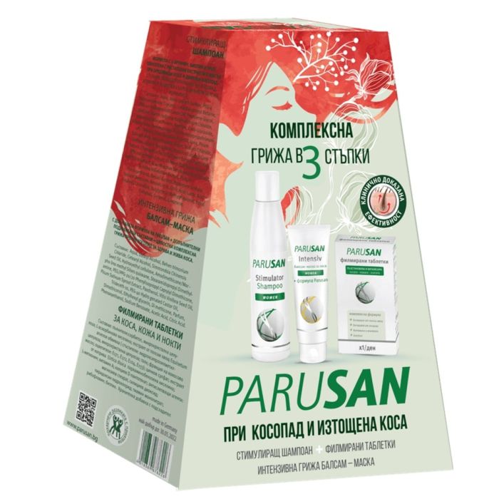 Parusan Комплексна грижа в 3 стъпки при косопад и изтощена коса Стимулиращ шампоан за жени + Интензивна грижа балсам-маска + Филмирани таблетки Комплект съдържа: