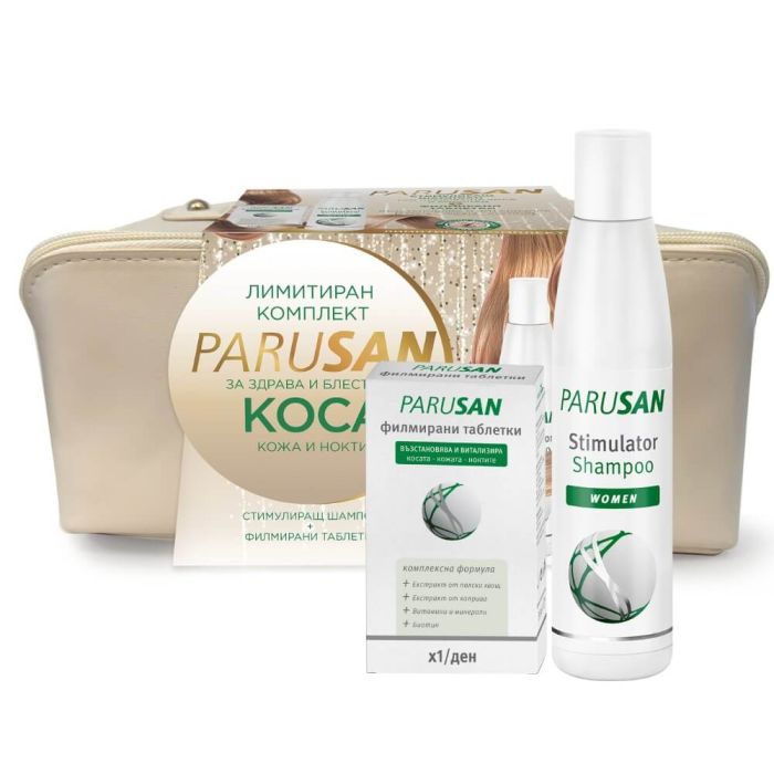 Комплектът съдържа: Parusan Стимулиращ шампоан за коса за жени 200 мл. 1 бр. + Parusan Kоса, кожа и нокти х 42 таблетки 1 опаковка + несесер 1 бр.