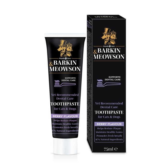 Barkin&Meowson Toothpaste for Cats & Dogs Berry Flavour e паста за зъби с широкоспектърно действие, за кучета и котки, която осигурява цялостна грижа за устната кухина. Формулирана е с натурални съставки и е предназначена за ежедневна употреба. Съдържа цинк цитрат, екстракт от грейпфрут и органичен нар, които редуцират плаката и минимизират риска от възпаления на венците. Инулинът, известен със своите пробиотични свойства спомага за баланс на микробиома. Зеленият чай и екстрактът от магданоз, които допълват формулата освежават дъха. Баркин и Мяусън Паста за зъби с пребиотик за куче и котка с вкус на горски плодове съдържа 97% натурални съставки. С вкус на горски плодове.