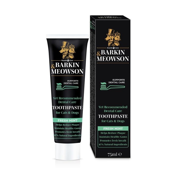 Barkin&Meowson Toothpaste for Cats & Dogs Fresh Mint e паста за зъби с широкоспектърно действие, за кучета и котки, която осигурява цялостна грижа за устната кухина. Формулирана е с натурални съставки и е предназначена за ежедневна употреба. Съдържа цинк цитрат, екстракт от грейпфрут и органичен нар, които редуцират плаката и минимизират риска от възпаления на венците. Инулинът, известен със своите пробиотични свойства спомага за баланс на микробиома. Зеленият чай и екстрактът от магданоз, които допълват формулата освежават дъха. Баркин и Мяусън Паста за зъби с пребиотик за куче и котка с вкус мента съдържа 97% натурални съставки. С вкус на мента.