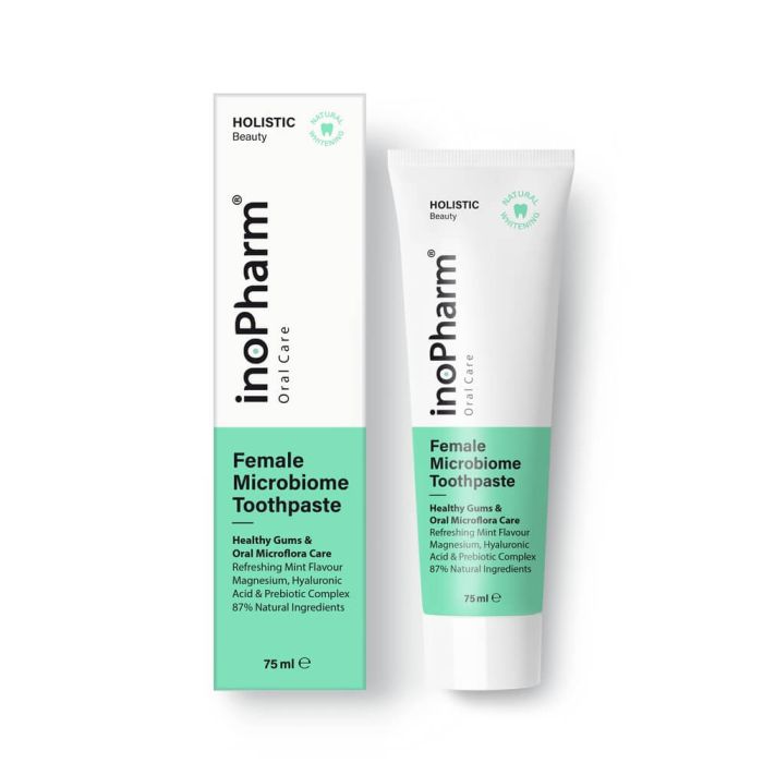 Inopharm Oral Care Female Microbiome Toothpaste e специализирана формула за поддържане на женската орална хигиена. Обогатена с Prebiulin Oral® за балансирана микрофлора и естествена бактериална защита. Фолиева киселина и витамини A, E и B5 подпомагат здравето на венците, а калциев лактат и хидроксиапатит стимулират усвояването на калция, реминерализацията на емайла и предотвратяват натрупването на плака. Инофарм Паста за зъби за балансиран женски микробиом поддържа естествената белота на зъбите. С хиалуронова киселина за подсилване на бариерната функция на венците и магнезий за здравословен минерален баланс. Съдържа витамин А. Преди употреба моля направете оценка на Вашия дневен прием.