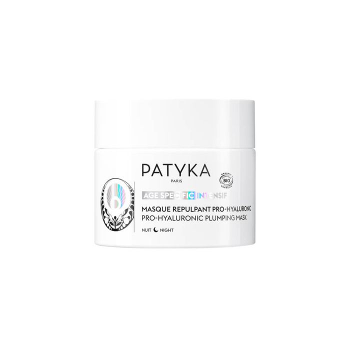 Patyka Age Specific Intensif Pro-Hyaluronic Plumping Mask е маска за лице, която изпълва кожата, изглажда линиите и чертите за постигането на ефект "бебешка кожа" на лицето. Иновация от лабораторията на PATYKA, Hyalu-Booster Complex [3 вида хиалуронова киселина, калциев кетоглюконат и полиглутаминова киселина] с прохиалуроново действие 360° презарежда, стимулира и защитава резервите от хиалуронова киселина на кожата, за да я уплътни интензивно. Подходяща за всеки тип кожа. Патика Ейдж Спесифик Интензив Изпълваща маска за лице с хиалуронова киселина съдържа 100% съставки от натурален произход и 53% съставки от органично земеделие.