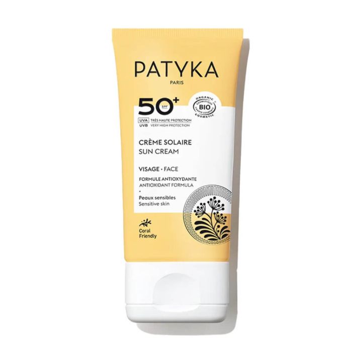 Patyka Suncare Face Sun Cream SPF50+ e слънцезащитен крем за лице, който осигурява висока защита срещу UVA/UVB лъчи и свободните радикали, отговорни за фотостареенето на кожата. Концентриран със 100% минерални филтри, кремът предлага широкоспектърна защита за всеки тип кожа, включително и чувствителната. Зелено микроводорасло и екстракт от индийски бук, два мощни растителни антиоксиданта, подсилват клетъчната защита и предотвратяват преждевременното стареене на кожата. Чиста и натурална хиалуронова киселина доставя интензивна хидратация. Флуидната и лека текстура оставя невидимо покритие, без мазен и лепкав завършек, без бели следи. Подходящ за бременни и деца над 3 г. Подходящ за нанасяне преди грим. Водоустойчив. 100% натурален аромат с нотки на алое вера, водна лилия, бял жасмин и бадемов цвят. Патика Сънкеър Слънцезащитен крем за лице SPF50+ съдържа 99,9% съставки от натурален произход и 23,5% съставки от органично земеделие.