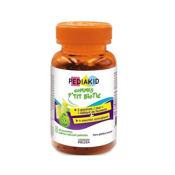Pediakid Gommes Probiotiques представлява хранителна добавка с пробиотични бактерии, специално разработена за деца. Педиакид Гъмис Пробиотикс Пробиотични дъвчащи мечета за деца е под формата на желирани мечета с приятен ябълков аромат, който децата харесват. Пробиотичните мечета възвръщат баланса на стомашно-чревната флора при и след прием на антибиотици или при храносмилателни проблеми. Продуктът подпомага и имунната система, допринасяйки за цялостното здраве на детето. Специалната формула на мечетата се отличава със съдържанието на цели 4 вида млечнокисели бактерии - Lactobacillus casei, Lactobacillus acidophilus, Lactobacillus plantarum, Streptococcus thermophilus, като в едно мече се съдържат 500 милиона пробиотични бактерии. За деца над 3-годишна възраст. Без желатин. Без глутен. Без лактоза. Без консерванти. Без изкуствени ароматизатори. Без оцветители. За деца над 3 години.