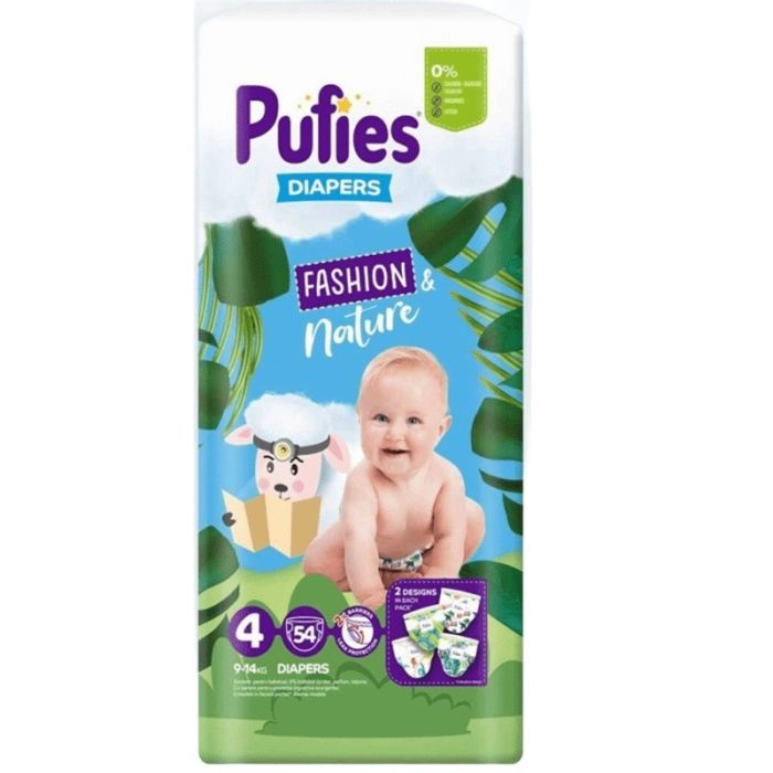 Пелени Pufies Fashion & Nature 4 Maxi представляват иновативни пелени за еднократна употреба предназначени за деца от 9 до 14 килограма. Пелените са специално създадени да осигурят максимален комфорт и отлична защита срещу протичане. Пелени Пуфис Фешън Енд Нейчър размер 4 Макси са част от серията Fashion&Nature, отличаваща се с дизайни, които са вдъхновени от природата. Те са създадени с грижа както за децата, така и за заобикалящата ни околна среда. Пелените се отличават със суперабсорбиращи каналчета, които улавят влагата и не позволяват тя да достигне кожата на детето. В същото време разполагат с двойни бариери, предпазващи от протичане до 12 часа. Отличават се и със своите меки и обгръщащи ластици, които прилягат точно на извивките на бебето, предоставяйки му усещане за комфорт и свобода на движението. Продуктът е изключително нежен към деликатната кожа на бебето, като и се поставя и сваля изключително лесно. Избелвани с хлор. Без парфюми. Без лосиони. Без целулоза. Дерматологично тествани.