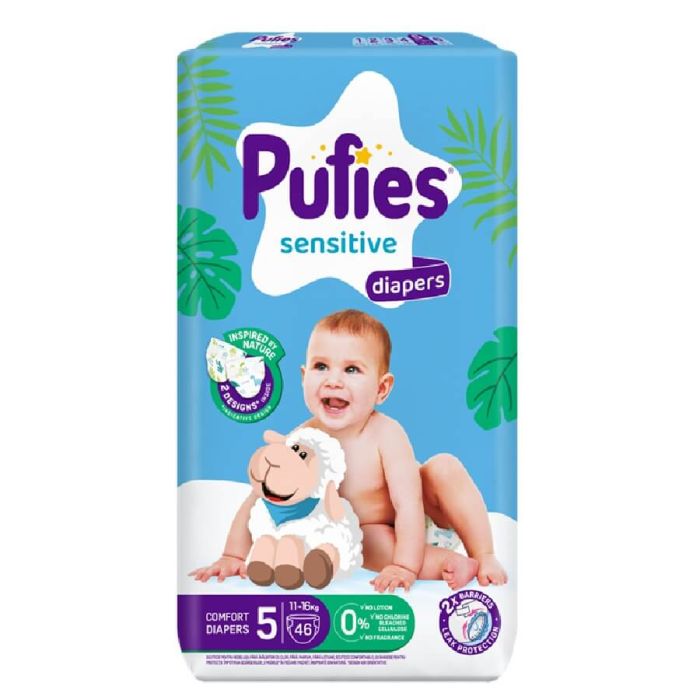 Пелени Pufies Sensitive 5 представляват ново поколение пелени с абсорбиращи каналчета за 3 пъти по-бързо попиване в сравнение с предишните пелени Pufies, които са специално създадени да осигурят максимален комфорт и отлична защита срещу протичане. Серията Sensitive, предлага 2 великолепни дизайна в пакет със сладки илюстрации, пелените са с анатомична форма, която следва всяко движение на бебето, осигуряваща допълнително удобство без значение дали то спи, играе или изследва света около себе си. Пелените са с точно прилягащи ластици, а областта oкoлo крaчeтaтa e зaщитeнa cъс специални бариери, които не допускат протичане. Пуфис Сензитив Бебешки пелени MP №5 са изработени от изключително мека и тънка материя, която позволява пелената да диша, тя остава суха дълго време, а нежната бебешка кожа е предпазена от запарване, зачервяване и подсичане. Специалната система за усвояване на влагата, попива изцяло течността и действа като бариера, за да защити бебешката кожа, оставяйки трайно чувство на комфорт и сигурност, а горният слой е създаден от копринени фибри, обогатен с лайка и алое вера, което спомага за намаляване риска от раздразнения. Kлиничнo тecтвaни. Xипoaлepгeнни.