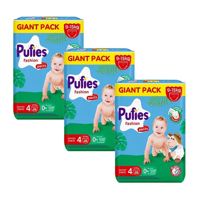 Комплектът съдържа: Пелени - гащички Pufies Pants Fashion размер 4, 9-15 кг GP 68 бр. 3 пакета