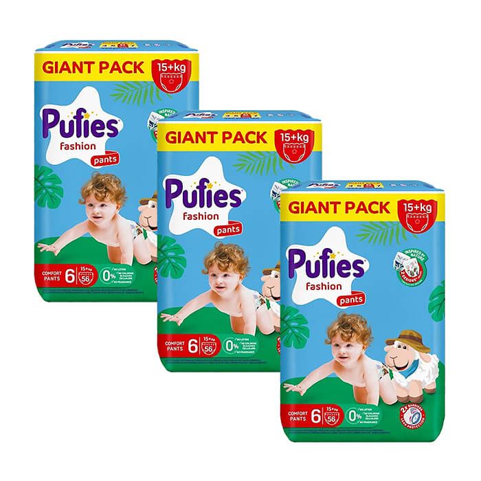 Комплектът съдържа: Пелени - гащички Pufies GP Pants Fashion размер 6 15+ кг. 56 бр. 3 пакета