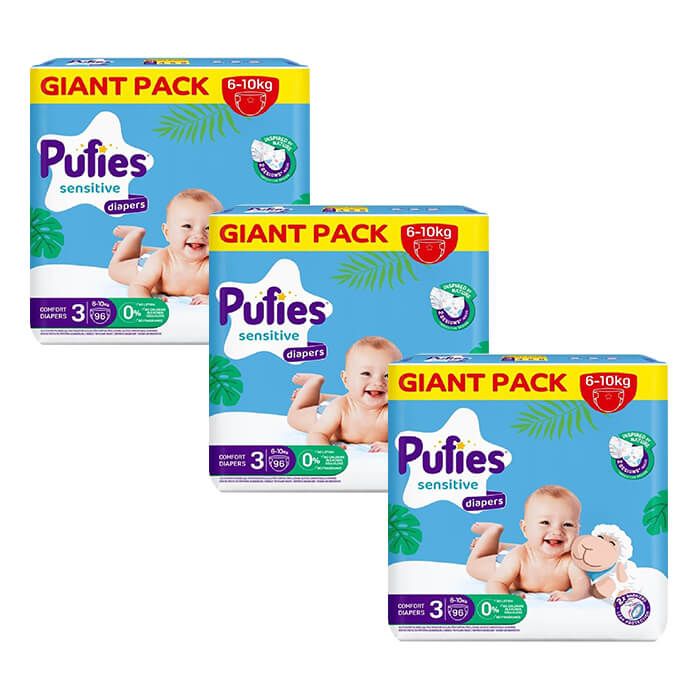 Комплектът съдържа: Пелени Pufies Sensitive 3 Midi 6-10 кг GP 96 бр. 3 пакета