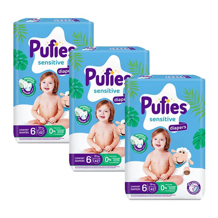 Комплектът съдържа: Пелени Pufies MP Sensitive размер 6 Extra Large 13+ кг. 42 бр. 3 пакета