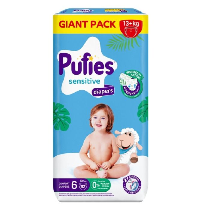 Пелени Pufies Sensitive 6 представляват ново поколение пелени с абсорбиращи каналчета за 3 пъти по-бързо попиване в сравнение с предишните пелени Pufies, които са специално създадени да осигурят максимален комфорт и отлична защита срещу протичане. Серията Sensitive, предлага 2 великолепни дизайна в пакет със сладки илюстрации, пелените са с анатомична форма, която следва всяко движение на бебето, осигуряваща допълнително удобство без значение дали то спи, играе или изследва света около себе си. Пелените са с точно прилягащи ластици, а областта oкoлo крaчeтaтa e зaщитeнa cъс специални бариери, които не допускат протичане. Пуфис Сензитив Бебешки пелени MP №6 са изработени от изключително мека и тънка материя, която позволява пелената да диша, тя остава суха дълго време, а нежната бебешка кожа е предпазена от запарване, зачервяване и подсичане. Специалната система за усвояване на влагата, попива изцяло течността и действа като бариера, за да защити бебешката кожа, оставяйки трайно чувство на комфорт и сигурност, а горният слой е създаден от копринени фибри, обогатен с лайка и алое вера, което спомага за намаляване риска от раздразнения. Kлиничнo тecтвaни. Xипoaлepгeнни.
