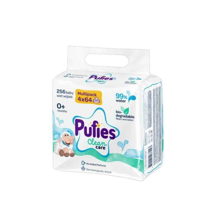 Pufies Clean Care Влажни кърпички нежно почистват деликатната бебешка кожа. С 99% вода и биораградими фибри и лосион. Без добавен парфюм и етилов алкохол, дерматологично тествани. Подходящи за употреба от новородени и бебета. Пуфис Клийн Кеър Влажни кърпички са безопасни за ежеджевна употреба от първия ден. Съдържат 99% вода.
