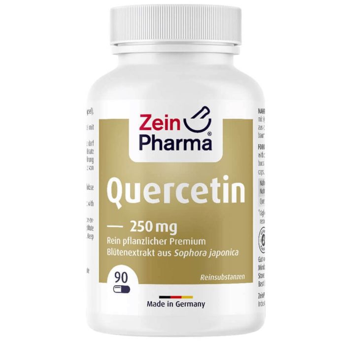 QUERCETIN Кварцетин 250 мг 90 капсули е добавка, която предоставя на организма Кверцетин извлечен от цветовете на дървото Японска акация (софора). Добавката се отличава с висока концентрация на активната съставка, в една капсула се съдържат 250 мг Полифенол. Полифенолът е изключително важен за имунитета, той има антиоксидантни и защитни свойства срещу свободните радикали, също играе роля на антихистаминово средство. Приема на Кварцетин капсули предпазва от възпаления и вирусни инфекции. Помага при Сенна хрема, при лечението на респираторни заболявания, като бронхит, при хрема. Приемът на Кварцетин капсули ще помогне за нормалното функциониране на сърцето и кръвоносните съдове и ще регулира високото кръвно налягане. Добавката се препоръчва и като помощно средство при коронавирусни инфекции.