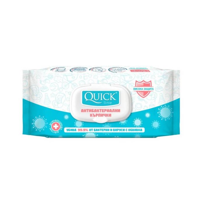 Quick Line Антибактериални мокри кърпи са с антибактериалната формула, която осигурява надеждна защита срещу бактерии, гъбички и вируси с обвивка, като същевременно поддържа високо ниво на хигиена.Куик Лайн Антибактериални мокри кърпи имат овлажняващо, омекотяващо и освежаващо действие и оставят приятен аромат след употреба. Кърпичките са изработени от здрава, неразтеглива материя и съдържат хипоалергенна формула, подходяща за ежедневна употреба.