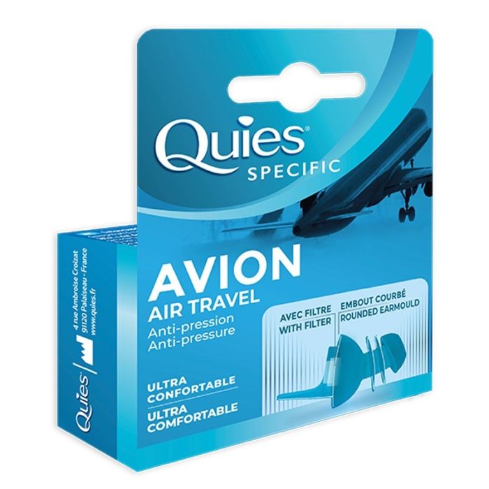 Quies Avion Air Travel са силиконови тапи за уши с филтър, създадени специално за използване по време на пътуване със самолет, като спомагат за намаляване на дискомфорта, свързан с промените в налягането. Те ограничават въздействието на резките разлики в налягането върху ушите и подпомагат предотвратяването на болка, усещане за заглъхване или виене на свят, като същевременно редуцират шума с до 18 dB, без да изолират напълно от околната среда. Благодарение на вградения филтър, тапите подпомагат по-плавното изравняване на налягането, което ги прави подходящи както при излитане и кацане, така и при други видове пътуване, включително с мотор. Изработени от мек силикон, който се адаптира лесно към формата на ухото, те не предизвикват раздразнения, дори при по-чувствителни уши. Киес Авион Еър Травъл Тапи за уши 18dB силиконови за възрастни, за пътуване са предназначени за многократна употреба, като поддържането им изисква единствено стандартно почистване преди и след използване. Компактният им дизайн позволява да се носят удобно и да бъдат винаги под ръка при пътуване.
