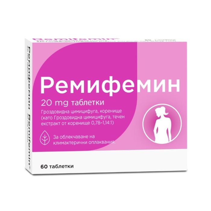 Ремифемин при менопауза e лекарствен продукт, създаден, за да облекчи симптомите на менопауза, като топли вълни, спонтанни изпотявания, разстройства на съня, нервност и депресивни състояния при намаляване на яйчниковата функция. Продуктът съдържа патентован изопропанолов екстракт (iCR) от корена на растението Cimicifuga racemosa /сребърна свещичка/, който е изключително добър аналог на хормоналната терапия. Ремифемин при менопауза не съдържа фитоестрогени и хормони, което го прави подходящ за дълготрайна употреба. Чист от изофлавони и гултен. Формулата е подходяща зе вегани.