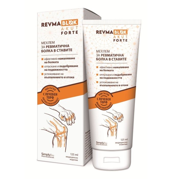Revma Blok Akut Forte е медицинско изделие, което има комплексно действие върху болката, възпалението и отока в ставите. Съдържа лечебен торф и натурални растителни екстракти. Ревма Блок Акут Форте мехлем е подходящ при ревматични болки в ставите, както и при дегенеративни ставни нарушения или претоварване на ставите. Ефективно намалява болката, сковаността, изтръпването и триенето на ставите и подпомага тяхната регенерация. Допринася значително за успокояване на възпалението и отока и подобрява подвижността на ставите. Има приятна и нелепкава консистенция.