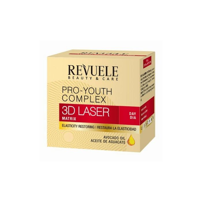 Revuele 3D Laser Firming day cream е подхранваща формула с лифтинг ефект, обогатена с алое вера и авокадо. Предназначен да възвърне плътността, еластичността и младежкото излъчване на кожата, като същевременно я хидратира интензивно. Кремът образува лек „микро воал“ върху кожата, който има стягащ и изглаждащ ефект. Използването на Ревуеле 3D Лазер Дневен крем за лице, помага кожата да изглежда по-мека, по-млада и сияйна. При редовна употреба помощните и активни съставки подпомагат намаляването на бръчки, предотвратяват появата на нови и подпомагат поддържането на сияйна и стегната кожа.