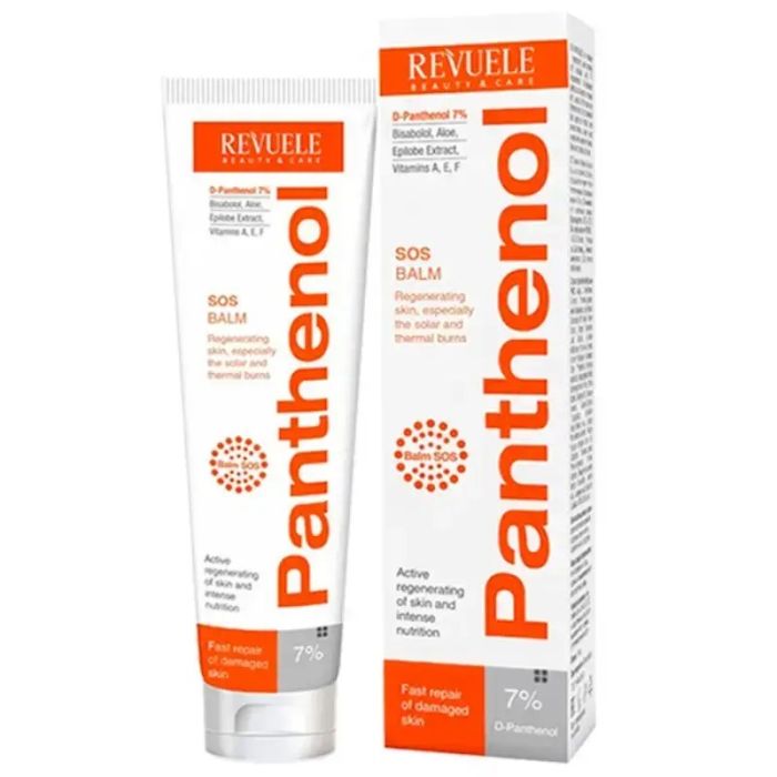 Revuele Panthenol SOS Balm е създаден с цел да подпомага регенерацията на кожната тъкан след слънчеви и термични изгаряния. Благодарение на високото съдържание на декспантенол (D-пантенол), той дълбоко хидратира засегнатите участъци от епидермиса и подпомага обновяването им на клетъчно ниво, като съдейства за изглаждане на проблемните области и намаляване на дехидратацията. Активната съставка бързо се усвоява от тъканите и се преобразува в пантотенова киселина, елемент от коензим А, който играе ключова роля в процесите на възстановяване и оформяне на здрава кожна структура. Формулата на Ревуеле Пантенол SOS Балсам съдържа екстракт от Epiloba, компоненет с успокояващо действие, който намалява зачервяването и подпомага укрепването на защитната функция на клетките, увредени от UV-лъчение. Веган формула, без силикони.