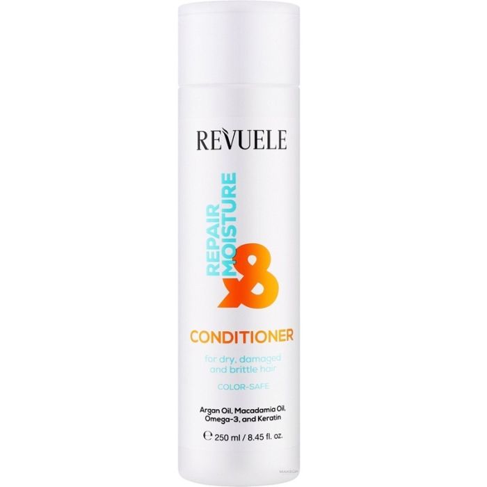 Revuele Repair & Moisture conditioner е формула богата на витамини и ценни растителни масла, която допринася да се възвърне естествената красота и жизненост на косата. Маслата от арган и макадамия проникват в дълбочина, като интензивно хидратират и подхранват косъма, придавайки му изключителна мекота и копринена гладкост. Добавените към формулата на Ревуеле Балсам възстановяване и хидратация, омега-3 мастни киселини и кератин подсилват структурата на косъма, намаляват накъсването и подобряват нейната устойчивост. Резултатът е по-силна, блестяща и видимо по-здрава коса. Балсамът е подходяща за суха и изтощена коса.