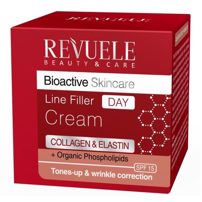 Revuele Bio Active Skincare Line Filler Day e дневен крем с богата текстура и изразено действие за намаляване на бръчките. Растителният фосфолипиден комплекс стимулира удвояването на естествената хиалуронова киселина, което видимо подмладява и изпълва кожата. Добавените колаген и еластин защитават от загуба на стегнатост и подпомагат процесите на регенерация, като удължават естествената свежест и красота на лицето. Ревуеле Колеген и еластин Биоактивен дневен крем-филър видимо изпълва бръчките, действа активно на клетъно ниво и резултатът е равномерен, гладък и подмладен вид на лицето.