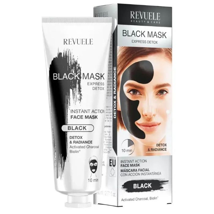 Дълбокото и лесно почистване на кожата стои в основата на действието на Revuele Black Express Mask с активен въглен. Благодарение на уникалните свойства на въглена, формулата работи като детокс продукт за лице. Фините въглеродни частици действат като магнит, привличат и извеждат натрупаните токсини, прах и замърсявания от порите, подпомагат обновяването на клетките и спомагат за регулиране на излишния себум. Активният въглен поддържа оптималния кислороден баланс на кожата, видимо свива порите и намалява появата на пъпки. Допринася за подобряване на цялостното състояние на епидермиса и свежия, сияен вид. Ниацинамидът изглажда, озарява и съживява лицето, като подобрява структурата и равномерността на тена. Намалява кожните несъвършенства и стяга кожата. Ревуеле Черна маска с незабавен ефект притежава нежен ексфолиращ ефект.