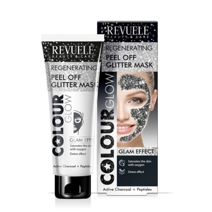 Revuele Mask Peel Off Glitter Charcoal е пилинг маска с черен брокат, активен въглен и пептиди, която стимулира интензивната регенерация на кожата и повишава метаболитната ѝ активност. Маската ефективно почиства и освежава кожата, като подобрява еластичността и намалява видимите признаци на умора. Активният въглен премахва токсините, дълбоко почиства порите и стимулира обновяването на клетките. Пептидите укрепват епидермалната структура и подпомагат синтеза на колаген, като намаляват фините линии и бръчки. Кожата остава гладка, матова и видимо по-здрава, с равномерен и сияен тен. Ревуеле Черна регенерираща маска за лице с отлепване е перфектното допълнение към рутината за красота, добавяйки блясък и свежест на всяка кожа.