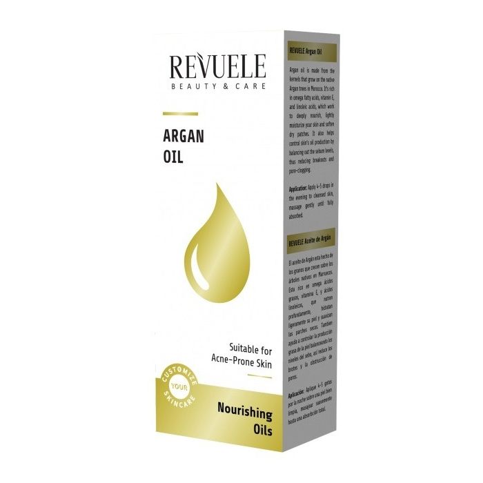 Revuele Cys Argan oil е смес от естествени екстракти и арганово масло. Съдържа омега 3 и витамин Е, както и линолова киселина, които подхранват в дълбочина, хидратират и балансират кожата. Спомага за премахване на прекаленото омазняване и озарява тена. Ревуеле Серум с Арганово масло