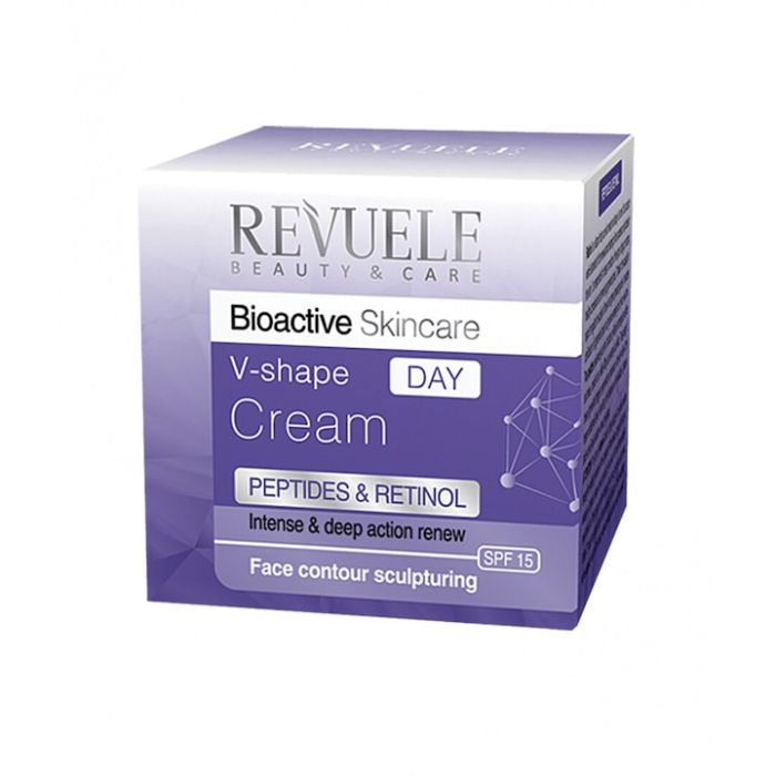 Revuele Bioactive Peptides & Retinol V-Shape Day Cream е дневен крем, създаден да възвърне жизнеността и еластичността на кожата. Неговата лека и фина текстура се абсорбира бързо и създава усещане за комфорт. Формулата е обогатена с активен пептидно-ретиноиден комплекс, който стимулира клетъчното обновяване, насърчава производството на колаген и подобрява микроциркулацията. Така кожата постепенно става по-стегната, по-гладка и видимо по-озарена. Кремът работи целенасочено срещу първите и напредналите признаци на стареене, като помага за изглаждане на фини линии, подобрява текстурата и изравнява тена. Хидратиращите компоненти поддържат оптимален баланс на влага през целия ден, докато успокояващи вещества омекотяват и тонизират кожата. Съчетанието от пептиди, ретинил палмитат, хидролизиран пшеничен протеин и подхранващи емолиенти създава синергия, която придава на кожата по-младежко излъчване и по-оформен контур. Ревуеле Дневен крем за лице с пептиди е подходящ за всеки тип кожа и за зоните на шията и деколтето. Благодарение на защитните филтри и антиоксидантни добавки той помага за предпазване от външни агресори и забавя процесите на преждевременно стареене.