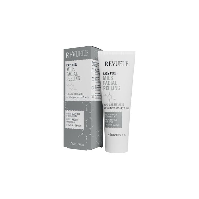 Revuele Easy Peel Milk Facial Peeling е нежен ексфолиант, създаден да освежава, изглажда и възстановява кожата чрез деликатно премахване на мъртвите клетки и натрупаните замърсявания. Кремообразната му текстура осигурява приятно усещане при нанасяне, като същевременно поддържа кожата хидратирана и мека. Формулата подпомага изравняването на тена, намалява видимостта на порите и възвръща естествения блясък на кожата. Подходящ за всички типове кожа, включително и за по-чувствителна, Ревуеле Изи Пийл Млечен пилинг за лице действа без да предизвиква зачервяване или сухота. При редовна употреба кожата изглежда по-гладка, по-чиста и значително по-свежа. Идеален за рутинна грижа, той подпомага цялостното обновяване на епидермиса и осигурява усещане за комфорт и чистота след всяко използване.