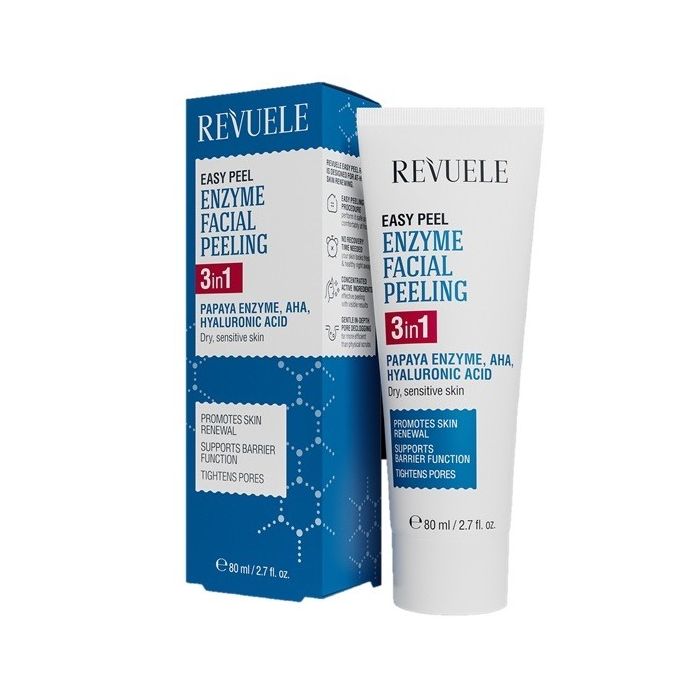 Revuele Easy Peel Enzime Facial Peeling 3 in 1 е деликатна формула с висока поносимост, която е чудесна алтернатива на химическите пилинги и агресивните ексфолиращи продукти. Формулиран с 3 активни съставки, които работят в симбиоза, за да осигурят видимо по-младежко излъчване на кожата, без да причиняват дискомфорт. Ензимът от папая успокоява и помага за изсветляване на петната по кожата, хиалуроновата киселина е важна за хидратацията на епидермиса, нежните алфа хидрокси ексфолиращи киселини работят за изравняване текстурата на кожата. Ревуеле Изи Пийл Пилинг за лице с ензими 3 в 1 е подходящ за всеки тип кожа.