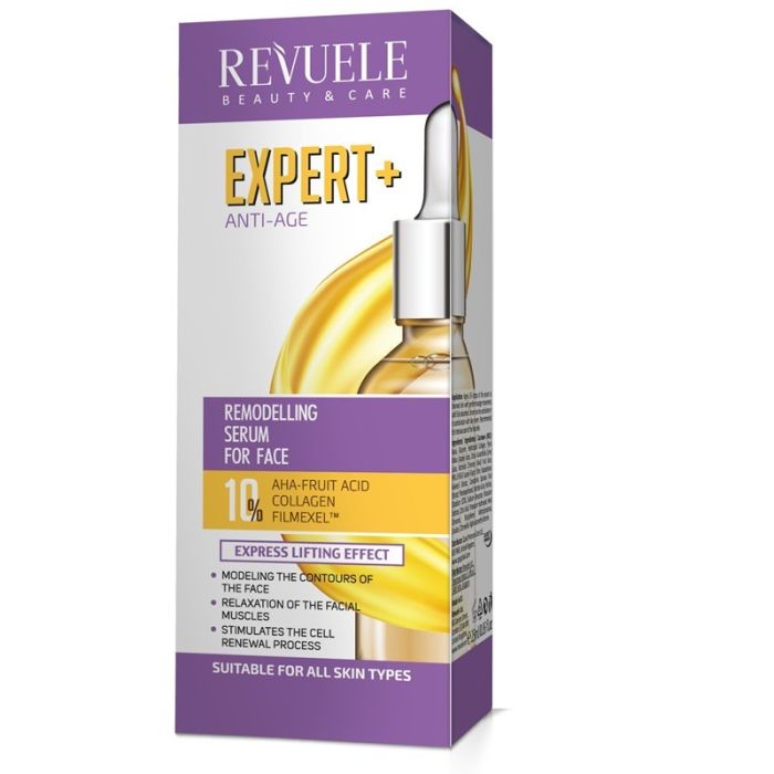 Revuele Expert + Anti-Age Remodelling Serum е анти ейдж серум, създаден да изглажда бръчките и да възстановява еластичността на кожата. Формулата му комбинира колаген за по-плътна и хидратирана кожа и AHA киселини, които нежно ексфолират и подобряват равномерността на тена. Серумът подпомага обновяването на кожните клетки, като оставя лицето по-озарено и свежо. Леката му текстура се абсорбира бързо и го прави подходящ за ежедневна употреба. При редовно нанасяне на Ревуеле Експерт Плюс антиейдже ремоделиращ серум кожата изглежда по-гладка, стегната и подмладена.