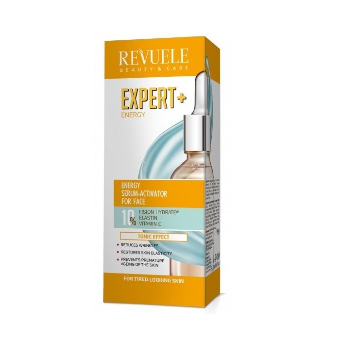 Revuele Expert+ Energy Vitamin C Serum For Face With Tonic Effect е тонизираща формула, която активира кожните клетки и спомага процеса на енергизиране. Спомага за ограничаване на пигментните петна, изсветлява и озарява тена. Подобрява еластичността и спомага за изпълване на фини линии. РевулелеЕксперт Плюс Енерджи серум-активатор се отличава с лека текстура, не е мазен. Подходящ за всички типове кожа.