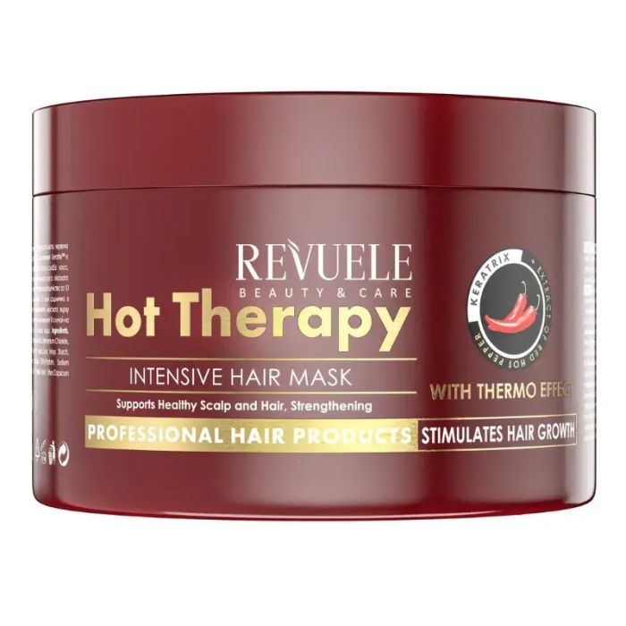 Revuele Thermo Effect Hot Therapy Mask е термоактивна маска, която комбинира мощното действие на екстракт от лют червен пипер и иновативния комплекс Keratrix™, за да активира естественото кръвообращение в скалпа и да ускори растежа на косата. Екстрактът от лют червен пипер създава лек загряващ ефект, който стимулира космените фоликули, подпомага укрепването на косъма и насърчава по-бързия му растеж. Той „събужда“ неактивните фоликули, овлажнява в дълбочина и прави косата по-еластична, плътна и сияйна. Keratrix™ е възстановяваща активна съставка, която защитава увредената и отслабена коса. Ревуеле Интензивна маска за коса с термо ефект подобрява еластичността и здравината на косъма, възстановява изтощените участъци и предпазва косата от бъдещи увреждания.