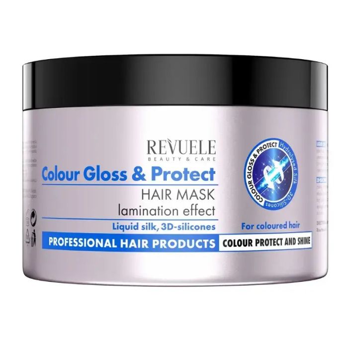 Revuele Color Gloss & Protect Hair Mask е създадена специално за нуждите на боядисаната коса, която изисква по-интензивна грижа, подхранване и хидратация. Формулата ѝ осигурява ламиниращ ефект, който обгръща косъма и му придава блясък. Водещата активна съставка е течна коприна. Тя представлява хидролизиран копринен протеин, способен да прониква в по-дълбоките слоеве на скалпа и косъма. Оставя косата сияйна, мека и защитена от вредните фактори на околната среда. Създава фин защитен филм, който подобрява текстурата и усилва интензитета на цвета. Включените в състава на Ревуеле Маска за боядисана коса 3D-силикони действат като професионална грижа за обем, блясък и гладкост. Те укрепват косъма отвътре и отвън, предотвратяват накъсването и запазват структурата му цяла. Улесняват разресването, не утежняват косата и запечатват увредените участъци за пълно възстановяване.