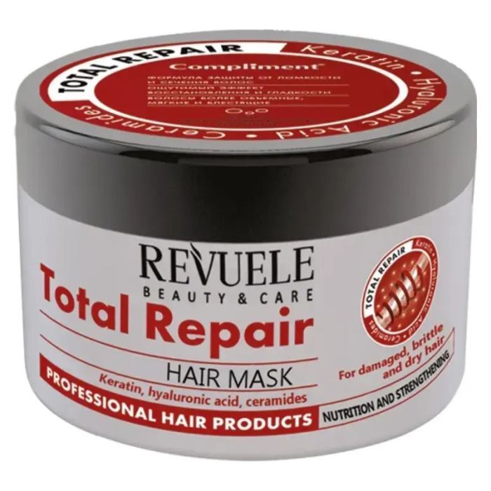 Revuele Total Repair Hair Mask допринася за дълбока регенерация само за няколко минути, като възвръща естествената жизненост, блясък и здравина на косъма. Формулата ѝ осигурява интензивна хидратация и подхранване, укрепва косъма от корена до върха и подпомага възстановяването на неговата структура. Маската действа в дълбочина, подобрява еластичността на косата и ѝ придава чудесен естествен блясък. Ревуеле Маска за коса Пълно възстановяване е подходяща и за боядисана коса, тя помага за удължаване на трайността на цвета, намалява сухотата и видимо подобрява цялостния вид на третирана коса.