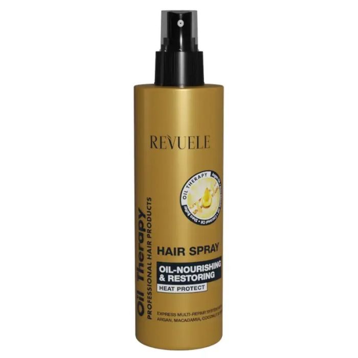 Revuele Oil Therapy Spray е специално създаден, за да осигури деликатна грижа и възстановяване на косата. Благодарение на богатия комплекс от масла той подхранва косъма, превръщайки сухата и уморена коса в мека, бляскава и жизнена. Ревуеле Ойл Подхранващ и възстановяващ спрей за коса, изглажда косъма и спомага за неговото заздравяване, предпазва от вредни топлинни въздействия.Веган формула.