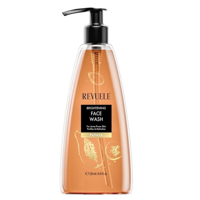 Revuele Brightening Face Wash Papaya е създаден специално за дълбоко почистване на проблемна, мазна и комбинирана кожа. Формулата ефективно премахва замърсявания, себум, мъртви клетки, остатъци от грим и бактерии, без да нарушава естествения хидробаланс. Оставя кожата чиста, матирана и освежена още след първото измиване. Благодарение на съдържанието на екстракт от папая и салицилова (BHA) киселина, Ревуеле Озаряващ измиващ гел за лице папая деликатно ексфолира и спомага естествено обновяване на клетките. Гелът помага за предотвратяване появата на несъвършенства, изсветлява тена и подобрява цялостната текстура на кожата.