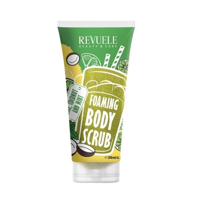 Revuele Foam body scrub Mint, coconut and lime съчетава нежен ексфолиращ ефект с освежаващ аромат на лайм, кокос и мента. При редовна употреба скрабът изравнява тена и омекотява кожата. Богатата пяна на Ревуеле Пенлив скраб за тяло лайм, кокос и мента нежно отстранява мъртвите клетки, стимулира обновяването на кожата и създава усещане за свежест и чистота. Ароматът e балансирана комбинация от цитрусови нюанси, сладък кокос и свежа мента, които носят моменти на удоволствие.