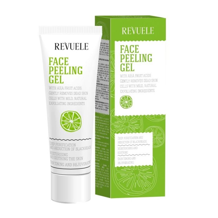 Revuele Facial gel peeling with ANA fruit acids ексфолира кожата без абразивни частици, като премахва мъртвите клетки с помощта на естествени ексфолиращи съставки. AHA киселините, извлечени от лимон и ябълки, действат като естествен, деликатен ексфолиант, подходящ и за чувствителна кожа. Екстрактът от лимон стяга и тонизира кожата, намалява порите и минимизира несъвършенствата, докато комбинацията от AHA киселина и витамин C подхранва, тонизира и предотвратява преждевременно стареене. Екстрактът от ябълка осигурява енергия на клетките и оставя свеж, плодов аромат. Ревуеле Ексфолиращ гел за лице с AHA плодови киселини е подходящ за всички типове кожа.