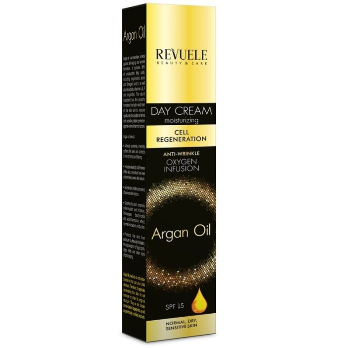 Revuele Anti Wrinkle Moisturising Argan Oil Day Cream With Spf 15 е специално разработен за отпусната и уморена кожа, склонна към лющене и зачервявания. Формулата осигурява интензивно подхранване и хидратация, като намалява видимостта на фините линии и бръчките, борейки се с признаците на преждевременно стареене. Антиоксидантите в състава защитават кожата от свободните радикали и външните агресии. Редовната употреба подпомага обновяването на клетките и придава свеж, младежки вид. Леката текстура на Ревуеле Дневен регенериращ крем с арганово масло SPF15 попива бързо, без да оставя мазен филм. Подходящ е за всички типове кожа, които се нуждаят от възстановяване и интензивна грижа. Кремът съчетава хидратация, подхранване и защита в една формула за видимо по-свежа и сияйна кожа.