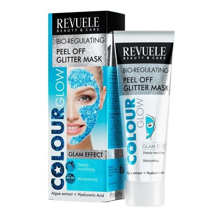 Revuele Color Glow Bio Regulating Glitter Peel Off Mask е пилинг маска за лице, която ефективно почиства, възстановява и подобрява еластичността на кожата и минимизира излишното производство на себум. Благодарение на екстрактът от водорасли (Laminaria Digitata) , които доставя богатство от лесно абсорбиращи се протеини, витамини, минерали и липиди, ефективно възстановява и защитава кожата. Той помага за намаляване на бръчките, стяга кожата, укрепва съществуващите колагенови и еластинови влакна. Добавената хиалуроновата киселина дълбоко хидратира и регулира водния баланс на кожата, подпомага синтеза на колаген. Използването на Ревуеле Синя Биорегулираща маска за лице с отлепване възвръща свежия, младежки вид на лицето, стяга кожата и озарява.
