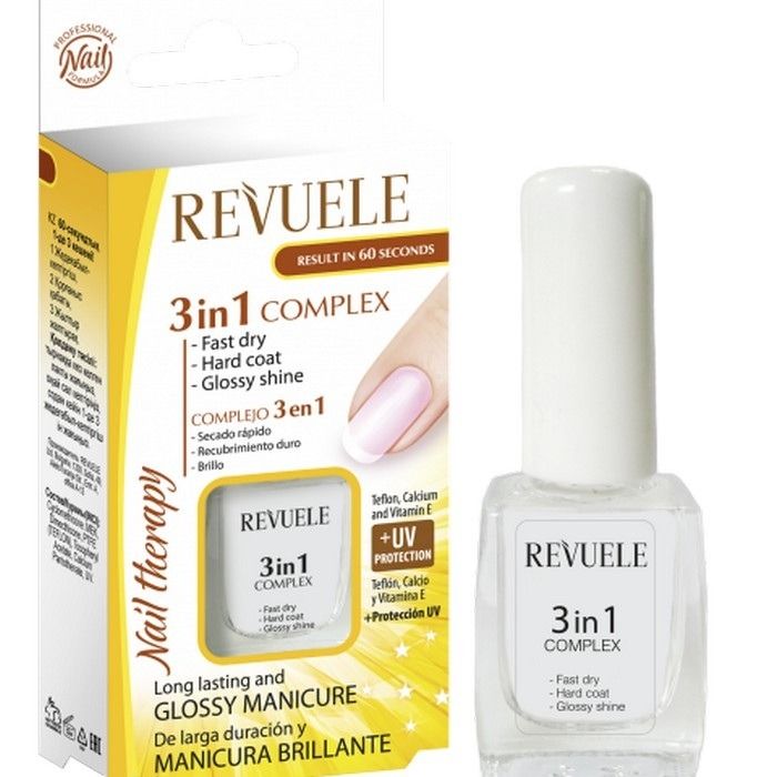 Revuele Complex for nails 3 in 1 е професионален укрепващ препарат за нокти, който предлага бързо и ефективно решение за перфектен, дълготраен маникюр. Формулата му осигурява здрава полимер-акрилна повърхност само за 60 секунди, като създава устойчив топ слой с тефлонова защита. Продуктът укрепва нокътната плочка, придава огледален блясък и предпазва лака от надраскване, износване и избледняване. Обогатен с комплекс от калций и витамин Е, Ревуеле Терапия за нокти 3 в 1, дълбоко подхранва и подсилва ноктите, а двойният UV филтър предотвратява пожълтяване и загуба на блясък. Идеален за тези, които търсят професионален финиш и дълготрайна защита само с един продукт.