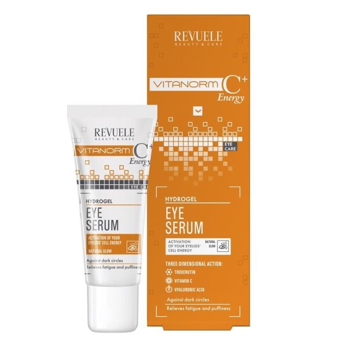 Revuele Hydrogel Eye Serum Vitanorm C + Energy е специална грижа за околоочния контур, обогатена с витамини, която ефективно стимулира клетъчната енергия на деликатната и чувствителна кожа на клепачите. Серумът интензивно подхранва, овлажнява, изглажда фините бръчици и намалява подпухналостта. Той се бори както с вътрешните, така и с външните причини за подпухналост и тъмни кръгове, успокоява и освежава зоната около очите. Тройната система за активиране на серума комбинира троксерутин, витамин C и хиалуронова киселина, които взаимно засилват действието си, облекчават зачервяванията и са препоръчителни при прекомерна пигментация. Хиалуроновата киселина осигурява дълготрайна хидратация, а витамин C тонизира кожата и засилва нейната защитна функция. Ревуеле Витанорм Ц Хидрогел серум за околоочен контур има лека текстура, която попива мигновено, подпомагайки естествената жизненост и правейки кожата около очите по-гладка, по-стегната и освежена благодарение на наситените с активни вещества укрепващи компоненти.